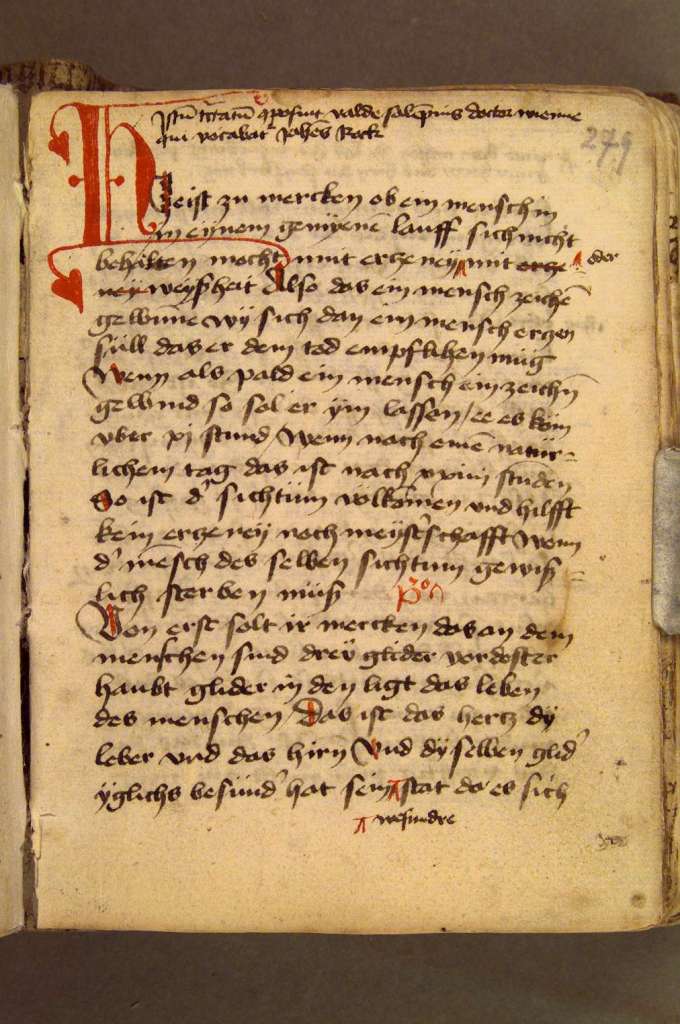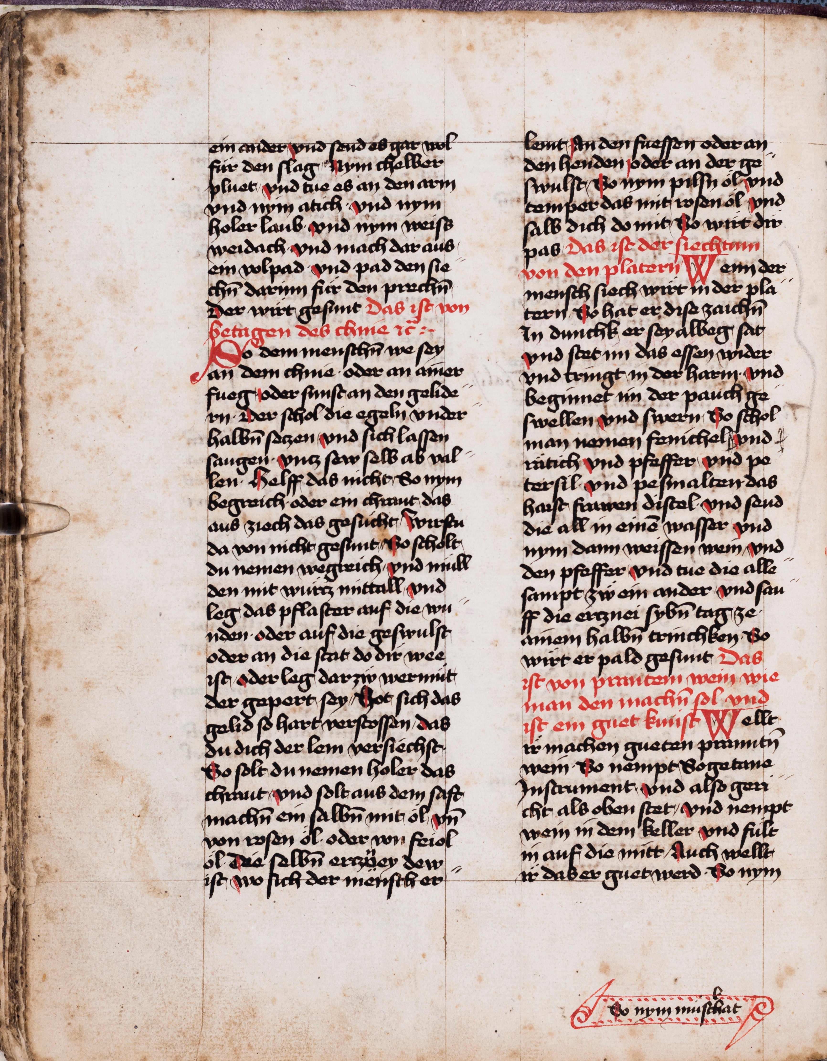 In der Grazer hauswirtschaftlich-medizinischen Sammlung nimmt die Pesttherapie und -prophylaxe allgemein einen großen Stellenwert ein. In dieser Handschrift finden wir auch (auf fol. 258r bis 264v) einen gereimten Pesttraktat, der geläufige Ratschläge zur Bewahrung oder Wiederherstellung der Gesundheit zusammenfasst. Gereimte Texte sind innerhalb der mittelalterlichen Fachliteratur tendenziell die Ausnahme, jedoch steigert der Reim die Memorierbarkeit des Textes, so dass dieser leichter auswendig behalten werden konnte. Für einen medizinischen Notfalltext konnte dies unter Umständen lebensentscheidend sein.
