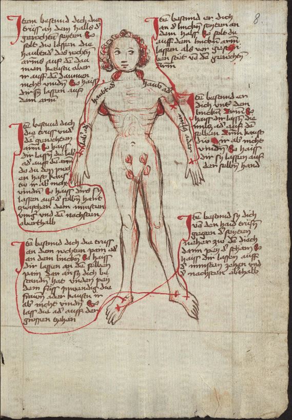 Anweisungen zum Aderlass in Pestzeiten wurden häufig durch solche Pestlassmännchen illustriert, die genau zeigten, an welcher Stelle das Blutgefäß beim Auftreten einer Pestbeule an einer bestimmten Stelle zu öffnen ist. (München, UB, Cod. Ms. 885, fol. 8r)